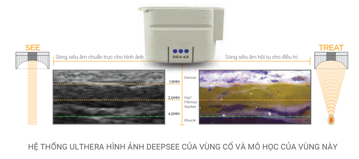 Điểm khác biệt của công nghệ Ultherapy Prime® đó chính là đầu dò siêu âm – DeepSEE cho phép bác sĩ quan sát được các lớp điều trị và tác động năng lượng chính xác và kiên định vào vùng thực hiện. Điều này rất quan trọng khi sử dụng các công nghệ siêu âm hội tụ để tránh các biến chứng không mong muốn khi không nhìn thấy chính xác vùng điều trị (như tác động vào xương, mạch máu, chất béo)