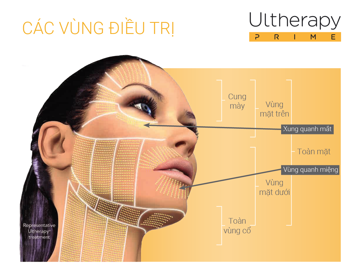 Công nghệ Ultherapy Prime® thích hợp cho việc điều trị nâng cơ tại các vùng như: vùng ngực, vùng cổ, mặt dưới, mặt trên và cung chân mày.